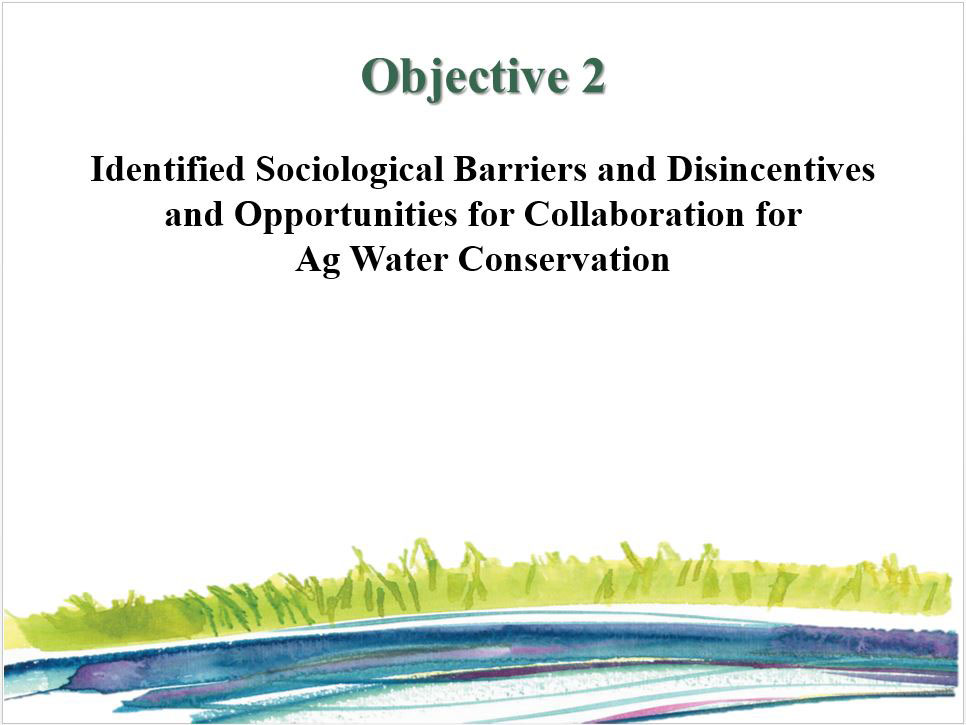 The purpose of Objective 2 was to qualitatively document and analyze the legal, economic, and social barriers related to the adoption of methods to conserve irrigation water in the CRB. The social science analysis associated with Objective 2 aimed to discover what factors a range of key stakeholders in agricultural water conservation (agricultural irrigators; municipal water suppliers; environmental organizations; and federal and state water agencies) see as determining their conservation-related decisions; what changes they see as necessary to make agricultural water conservation more appropriate and viable; and how they see their relationship to other water users' efforts to find new water sources for future expected CRB needs. This latter question is key to enlisting the active support of agricultural water users and other water interest groups in generating new water sources for expected supply gaps in the CRB.