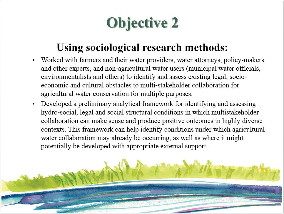 1) Developed a preliminary framework for identifying and assessing enabling hydrological, legal and social structural conditions that can help surmount barriers to agricultural water conservation and may, with appropriate support, facilitate multistakeholder collaboration around agricultural water in diverse local contexts.