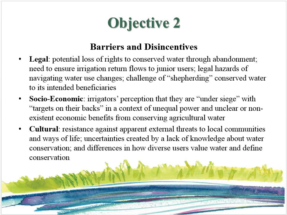 2) Identified and analyzed key legal and socio-economic barriers to agricultural water conservation in six case study regions. Legal barriers include the potential loss of rights to conserved water through abandonment, the need to ensure irrigation return flows to junior users, the legal hazards of navigating water use changes, and the challenge of "shepherding" conserved water to its intended beneficiaries. Socio-economic barriers include irrigators' perception that they are "under siege" with "targets on their backs" in a context of unequal power and unclear or non-existent economic benefits from conserving agricultural water. Cultural barriers include resistance against apparent external threats to local communities and ways of life; uncertainties created by a lack of knowledge about water conservation; and differences in how diverse users value water and define conservation.