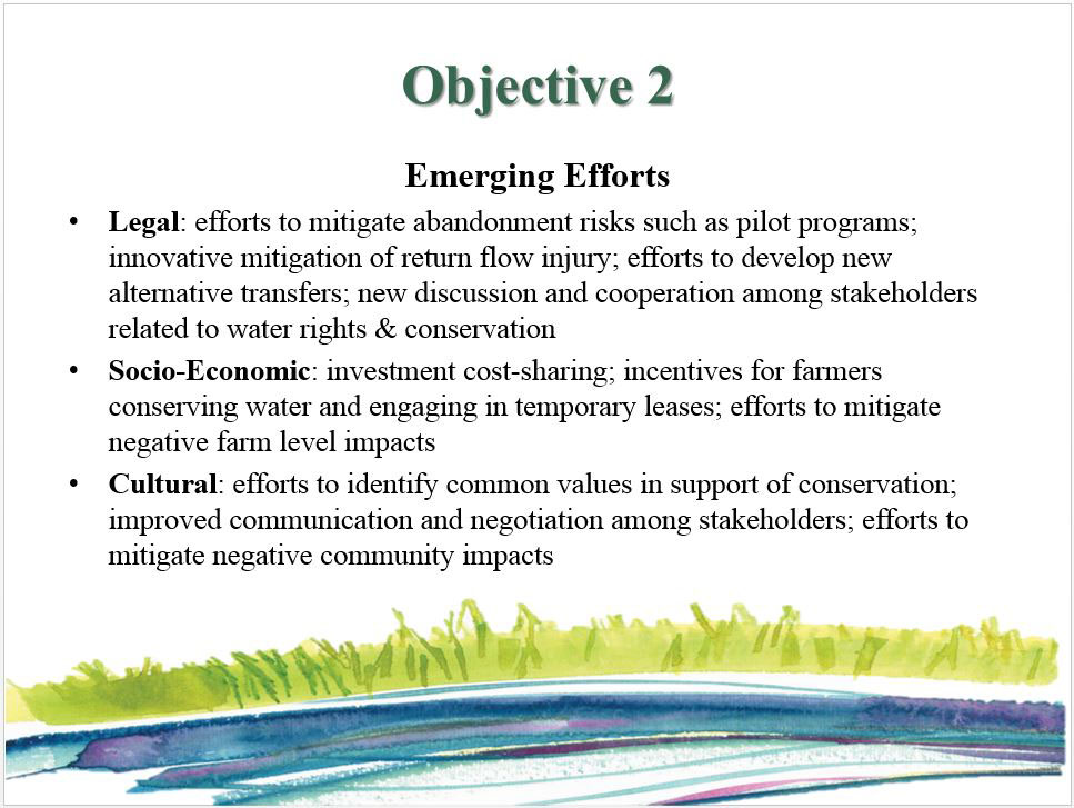 3) Identified and analyzed key enabling hydrological, legal and social conditions in six case study regions that may facilitate locally appropriate and effective multi-stakeholder collaboration around agricultural water conservation. Facilitating hydro-social conditions include favorable location of junior water users with legal rights to return flows; the ability of senior water rights holders to "shepherd" conserved water, and the existence of powerful upstream and downstream water users. Facilitating legal conditions include enabling state-level regulatory legislation; supportive frameworks for flexible water use changes and transfers; instream flow statues; and irrigator water rights that are structured in ways that support collaboration. Facilitating social conditions include external regulatory and political "push" factors that encourage irrigators to consider collaborating with other water users; the existence of multiple benefits for participants in collaboration; diverse water users' view that water conservation represents a community as well as agricultural issue; and users' overlapping or compatible definitions of water conservation.