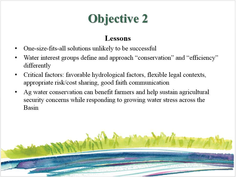 Using social science primary and secondary literature and field research methods, we systematically analyzed the diverse frameworks of incentives and disincentives shaping agricultural producers' decisions to engage or not engage in agricultural water conservation. We reviewed secondary academic and technical literatures related to agricultural water conservation. We carried out more than fifty semi-structured in-depth face to face and telephone interviews with a structured sample of producers involved in six cases of multi-stakeholder collaboration for agricultural water conservation for multiple purposes, and visited those projects in three CRB states: Colorado, Arizona and California.